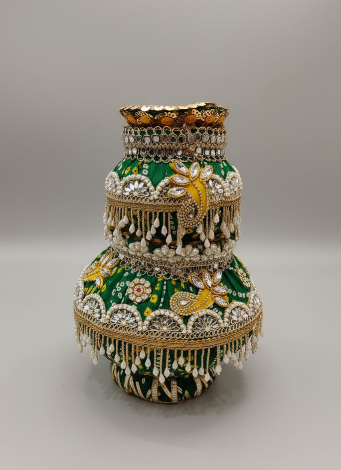 Adorned with intricate beadwork, sequins, pearls, and vibrant motifs, this matka brings cultural richness to any wedding function. Whether used in haldi, mehendi, griha pravesh, or the chaak ritual, it adds grace and charm to every ceremony.