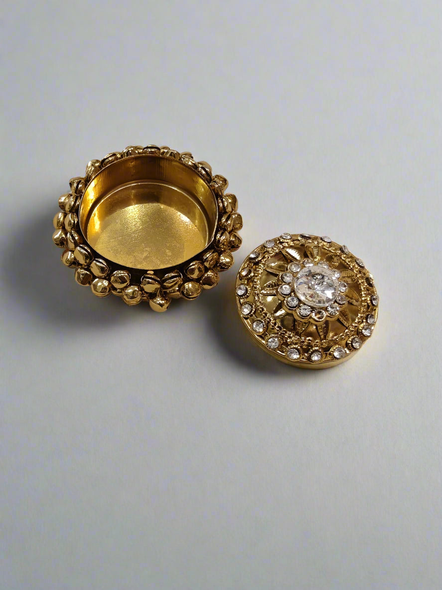 From The Wedding Station, this delightful round coin box showcases exquisite craftsmanship. The exterior is adorned with intricate metalwork and delicate ghungroo bells that create a gentle, charming sound. Opening the lid reveals a soft interior, perfect for keeping your precious coins secure.