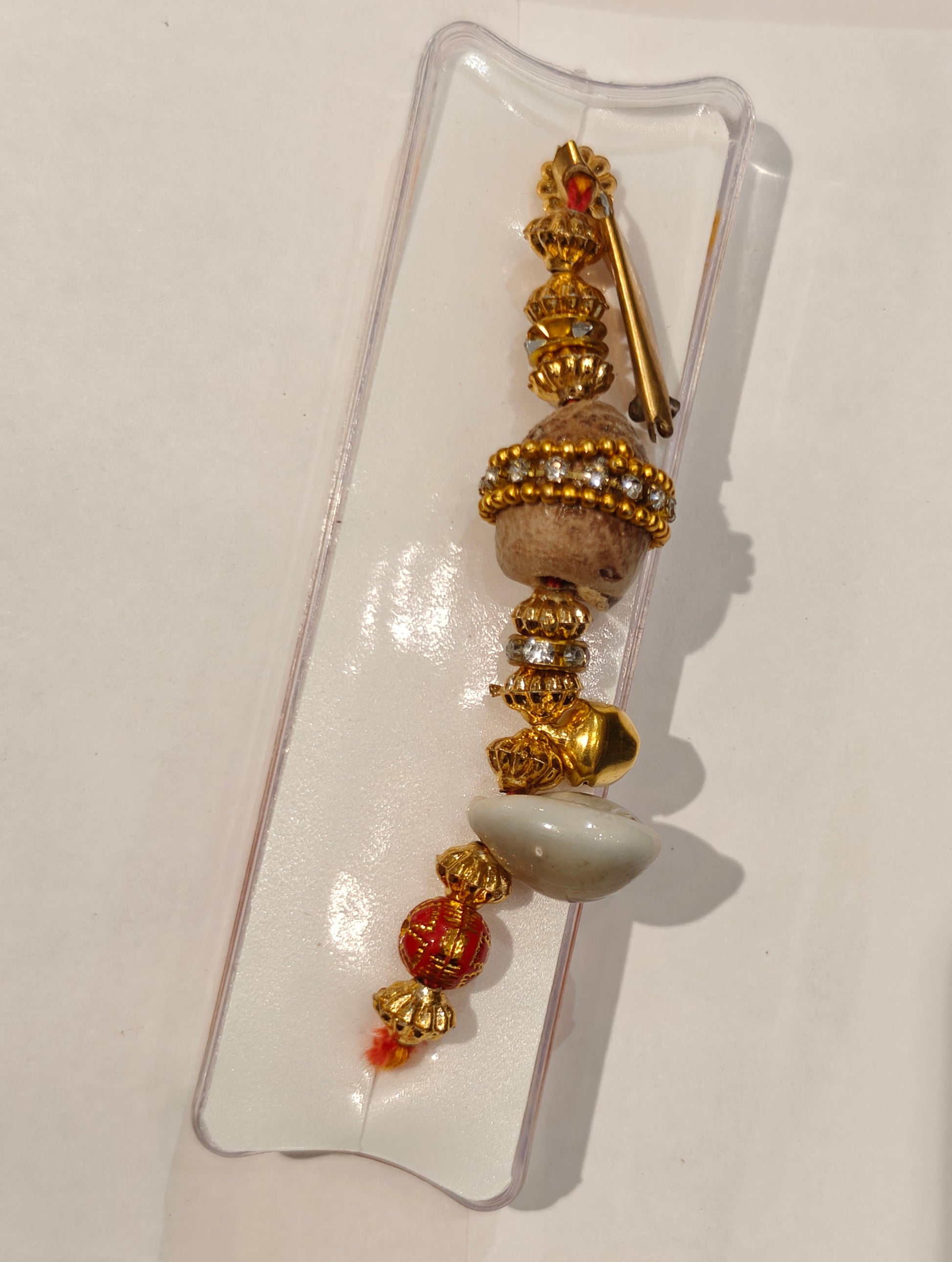 This beautifully handcrafted Kangana is an essential element in traditional Mandha wedding rituals. Designed with symbolic beads, metallic charms, and sacred items like supari (betel nut), kaudi, and iron piece, this Kangana is tied on the wrists of the bride and groom to mark the beginning of the wedding ceremonies. It serves as a divine protector, warding off negative energies and symbolizing purity, prosperity, and blessings from elders.