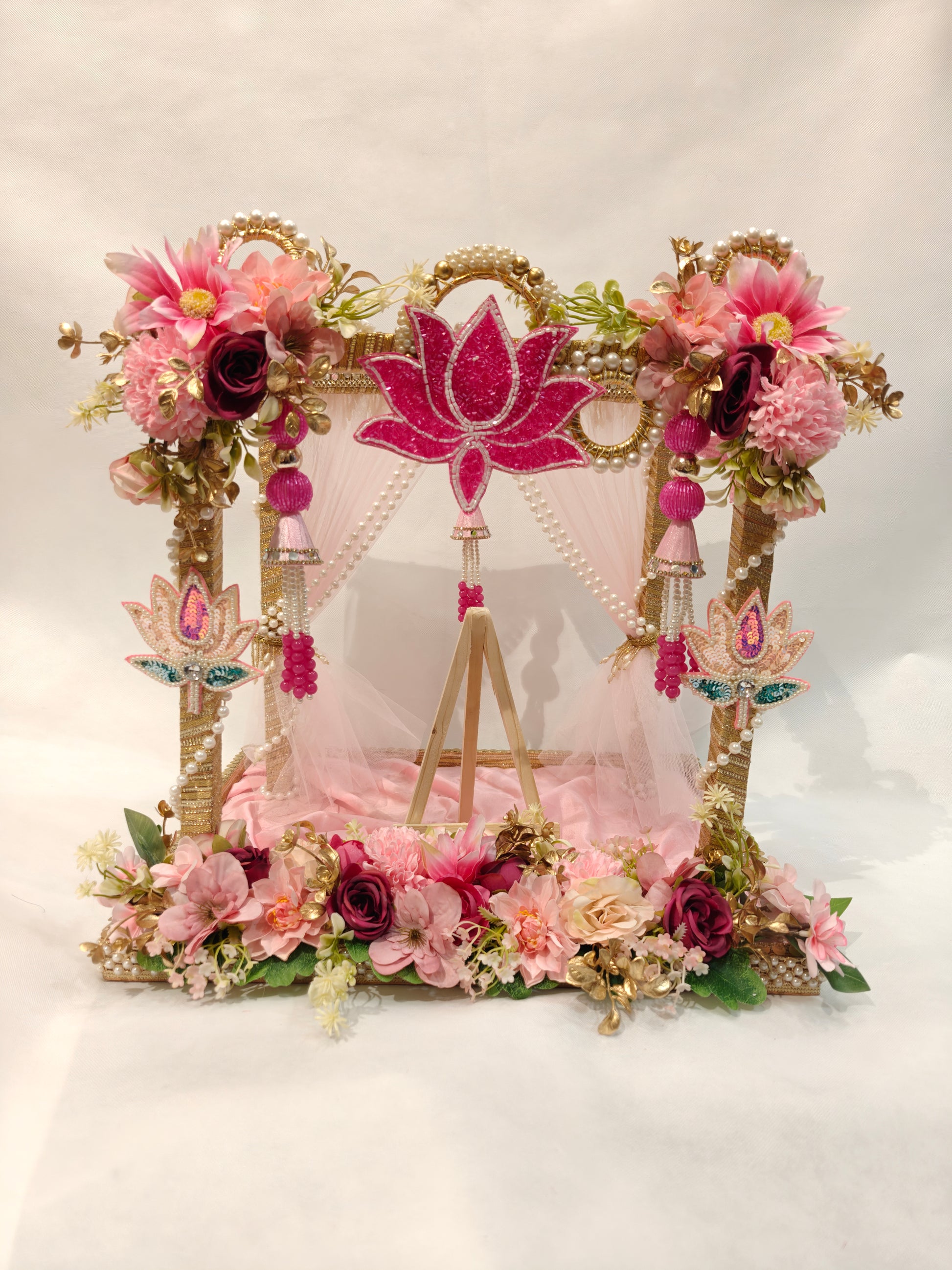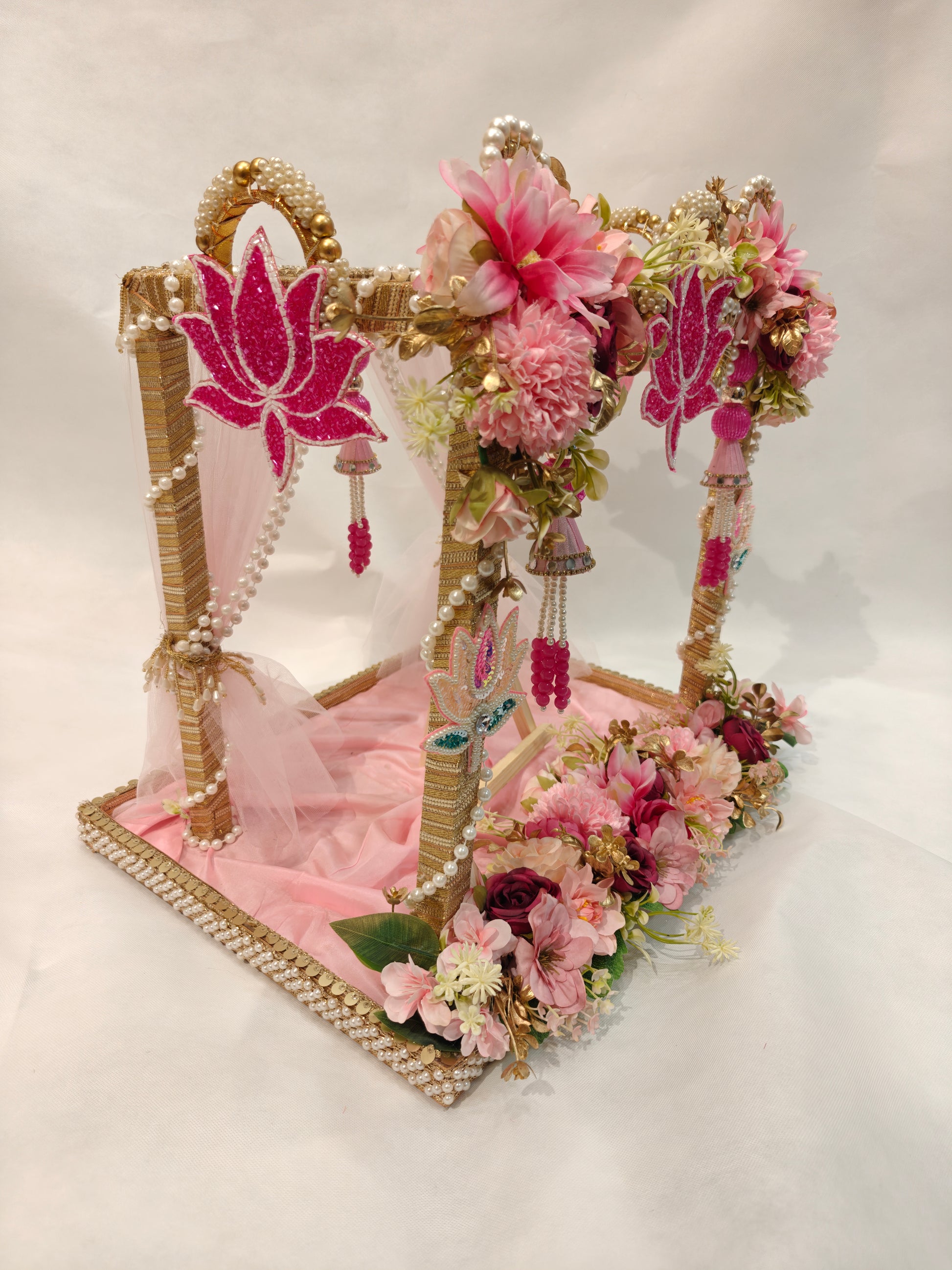 Adorned with luxurious floral arrangements, pearl detailing, soft drapery, and an auspicious lotus motif, this royal wedding card platter captures the essence of palace weddings and timeless rituals. The elevated stand at the centre allows the wedding invitation or shagun envelope to be displayed like a sacred vow, while the mandap-style frame symbolises blessings, prosperity, and new beginnings.